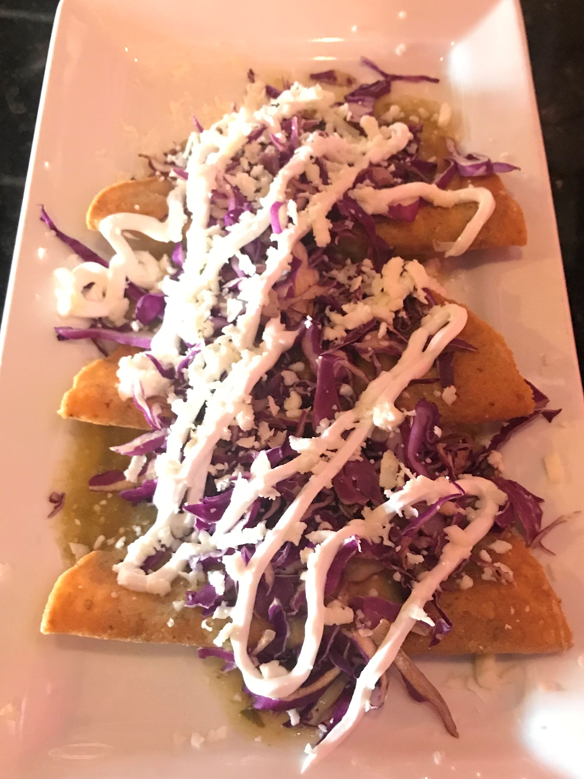 Our traditional 5" fried corn tortilla, filled with sautéed onions, tomatoes, mashed potato & spices, covered with green tomatillo sauce, red cabbage and sour cream. Garnished with queso fresco.