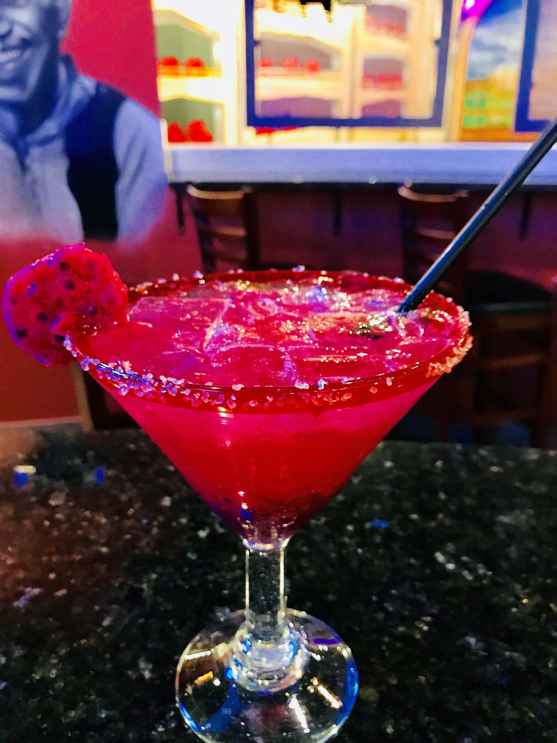 Campanario reposado watermelon liqueur, homemade margarita mix and orange wedge.